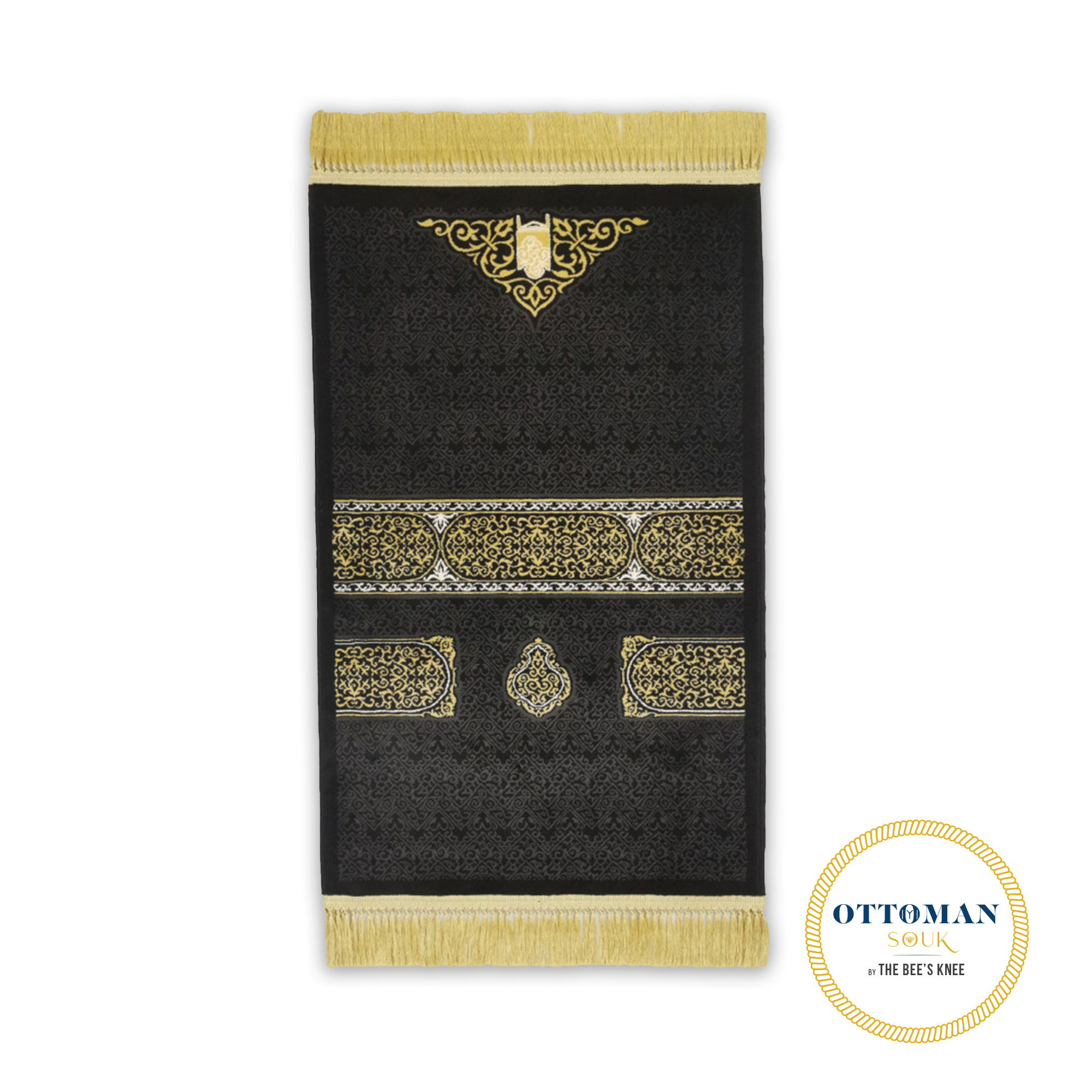 The Ka’bah Door Prayer Mat. Embraided and woven in the rich and elegant colours of gold and black. This prayer mat imitates the door of the Ka’bah. Note this design does not have any religious inscription on there.
